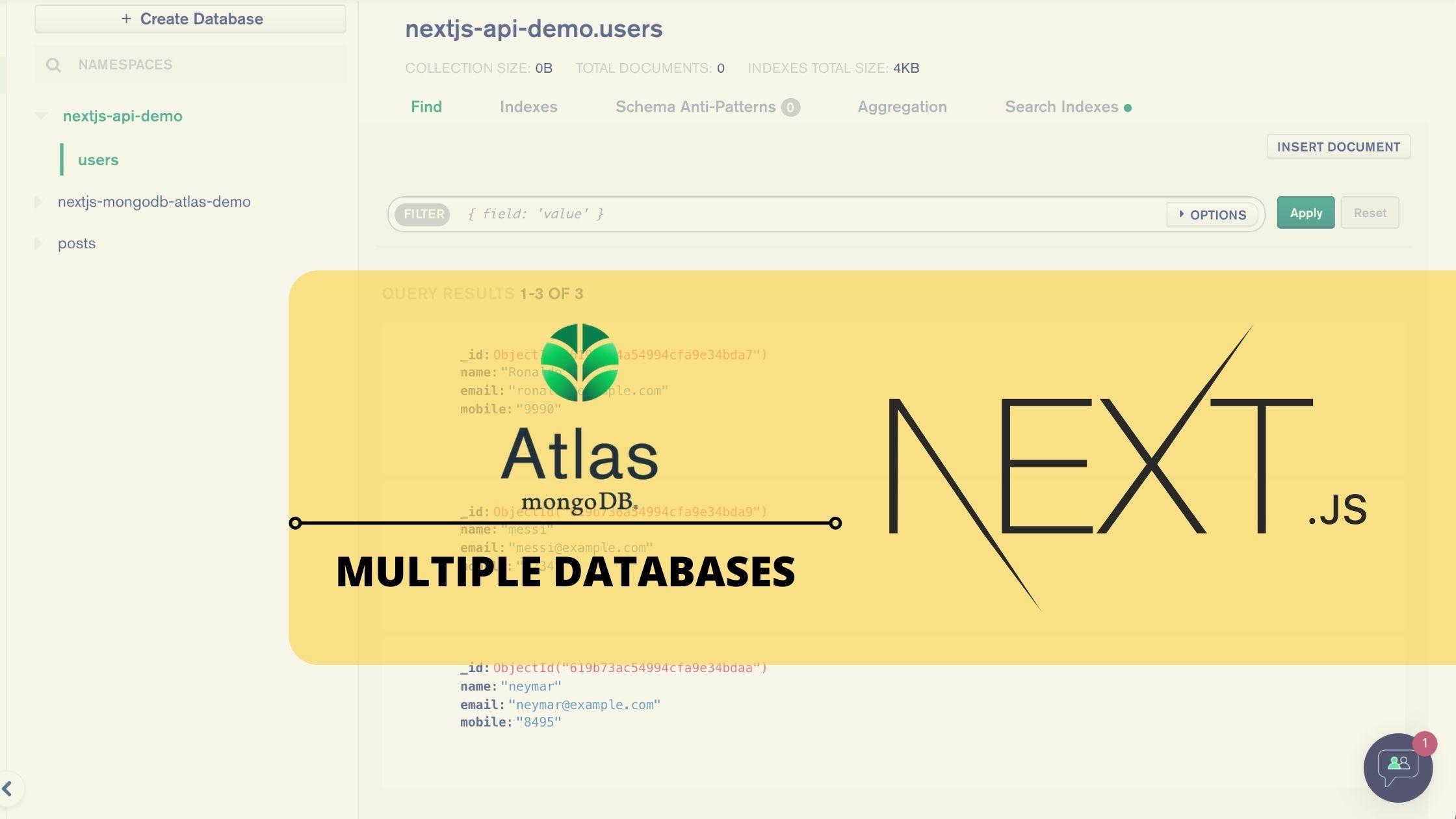 The database names are nextjs-mongodb-atlas-demo and nextjs-api-demo. The two databases contain the collection users with some dummy data.